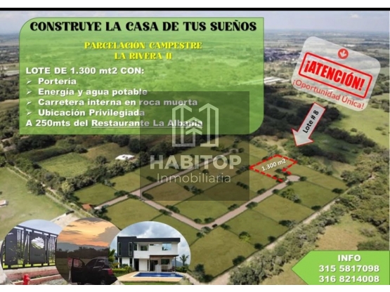 En Parcelación Campestre La Rivera II, a tan solo 250 metros del reconocido restaurante La Albania, se encuentra el Lote #8, un espacio único de 1.300 m² pensado para quienes buscan conectar con la naturaleza sin alejarse de la comodidad.